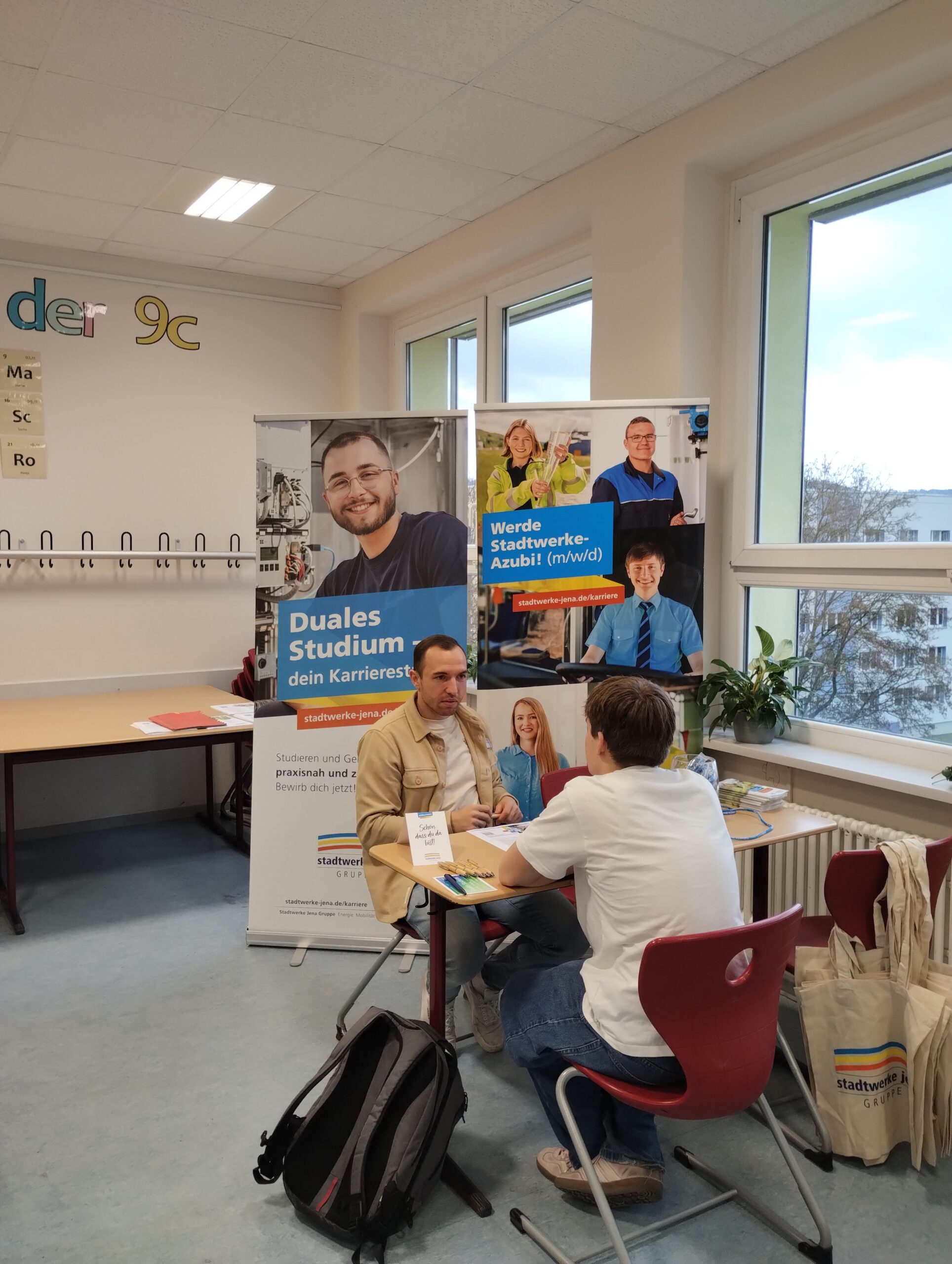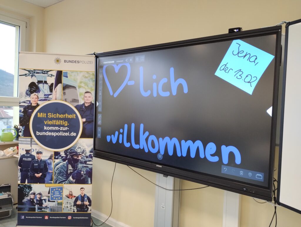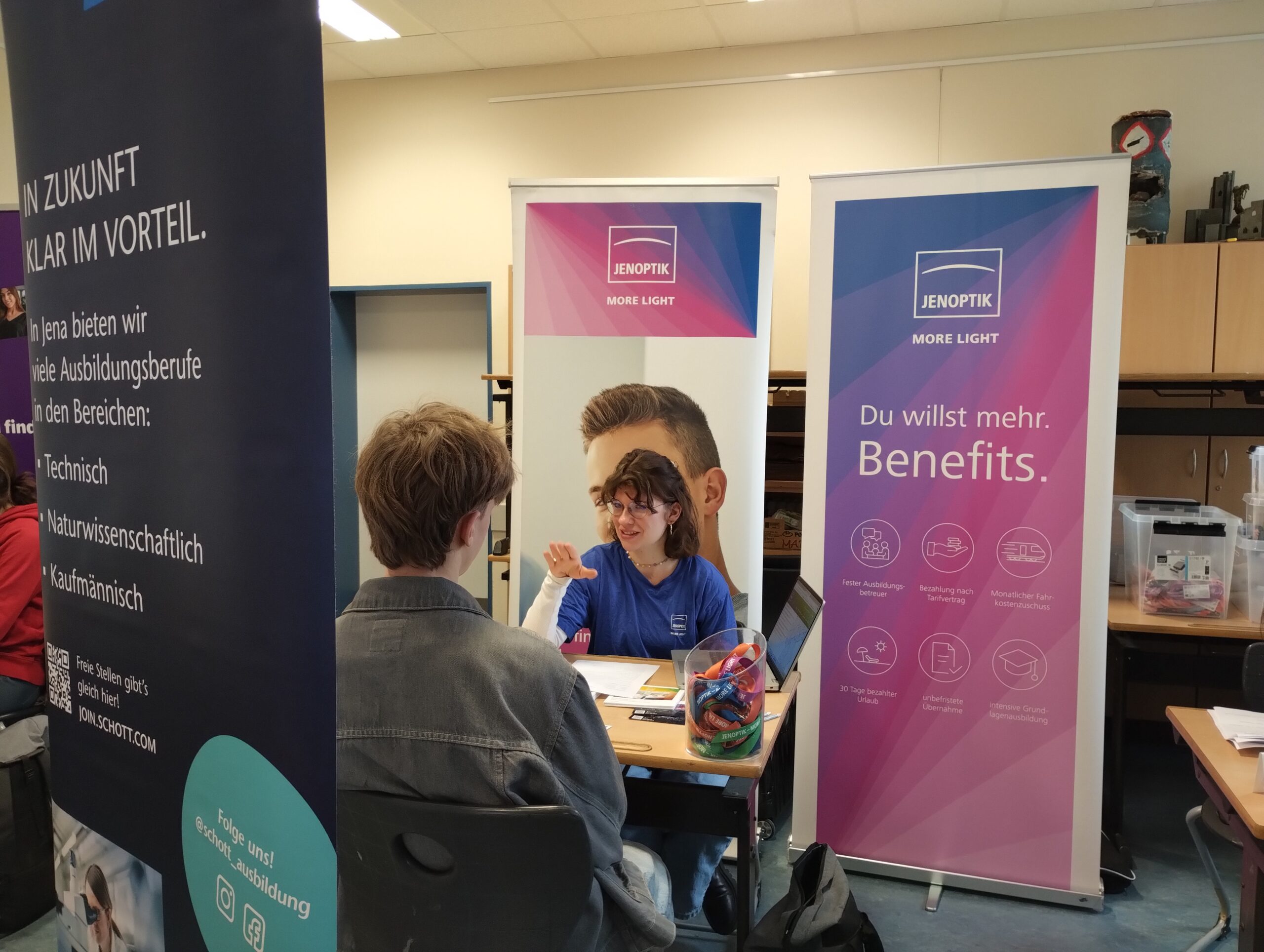 Am letzten Schultag vor den Winterferien erwartete unsere Elftklässler ein ganz besonderer Projekttag: Zum vierten Mal führten 18 regionale und überregionale Unternehmen einen Tag rund um das Thema Bewerbung durch. Unsere Schülerinnen und Schüler erhielten durch die Firma Jena Optronik GmbH einen Einblick in das unternehmensinterne Einstellungsverfahren und knobelten an dem mitgebrachten Wissenstest. Das Deutsche Luft- und Raumfahrtinstitut (DLR) zeigte unseren Elftklässlern, wie die Berufswelt durch KI beeinflusst werden wird. Im Bewerbungstraining erhielten unsere Schülerinnen und Schüler die Möglichkeit, mit drei Firmen ein jeweils 15minütiges Bewerbungsgespräch zu führen und von geschulten Mitarbeitenden ein ehrliches Feedback zu ihrem Auftreten und ihren vorbereiteten Lebensläufen zu erhalten. Abschließend bot eine Miniberufsmesse die Gelegenheit, mit allen Firmen noch einmal ins Gespräch zu kommen.