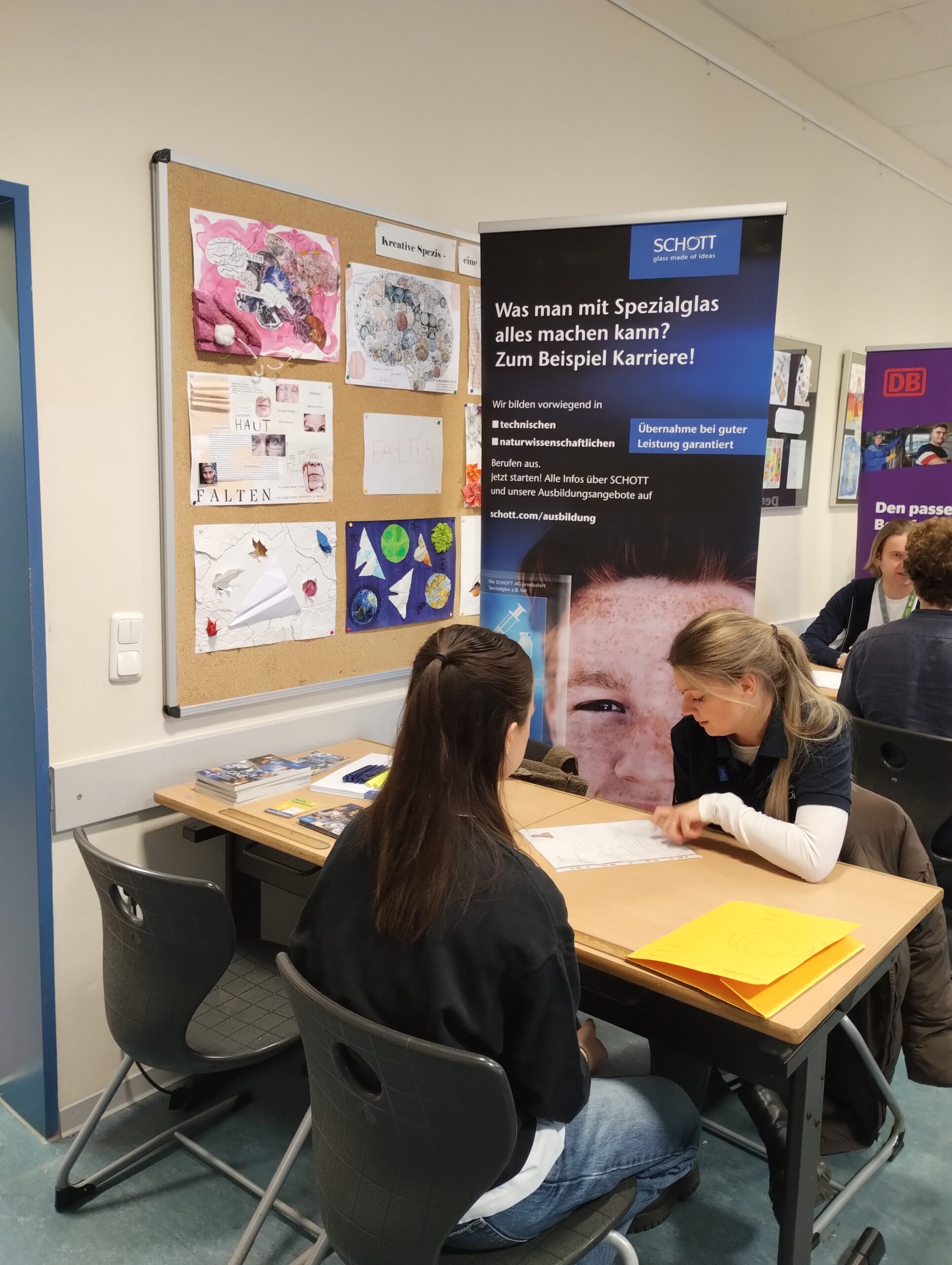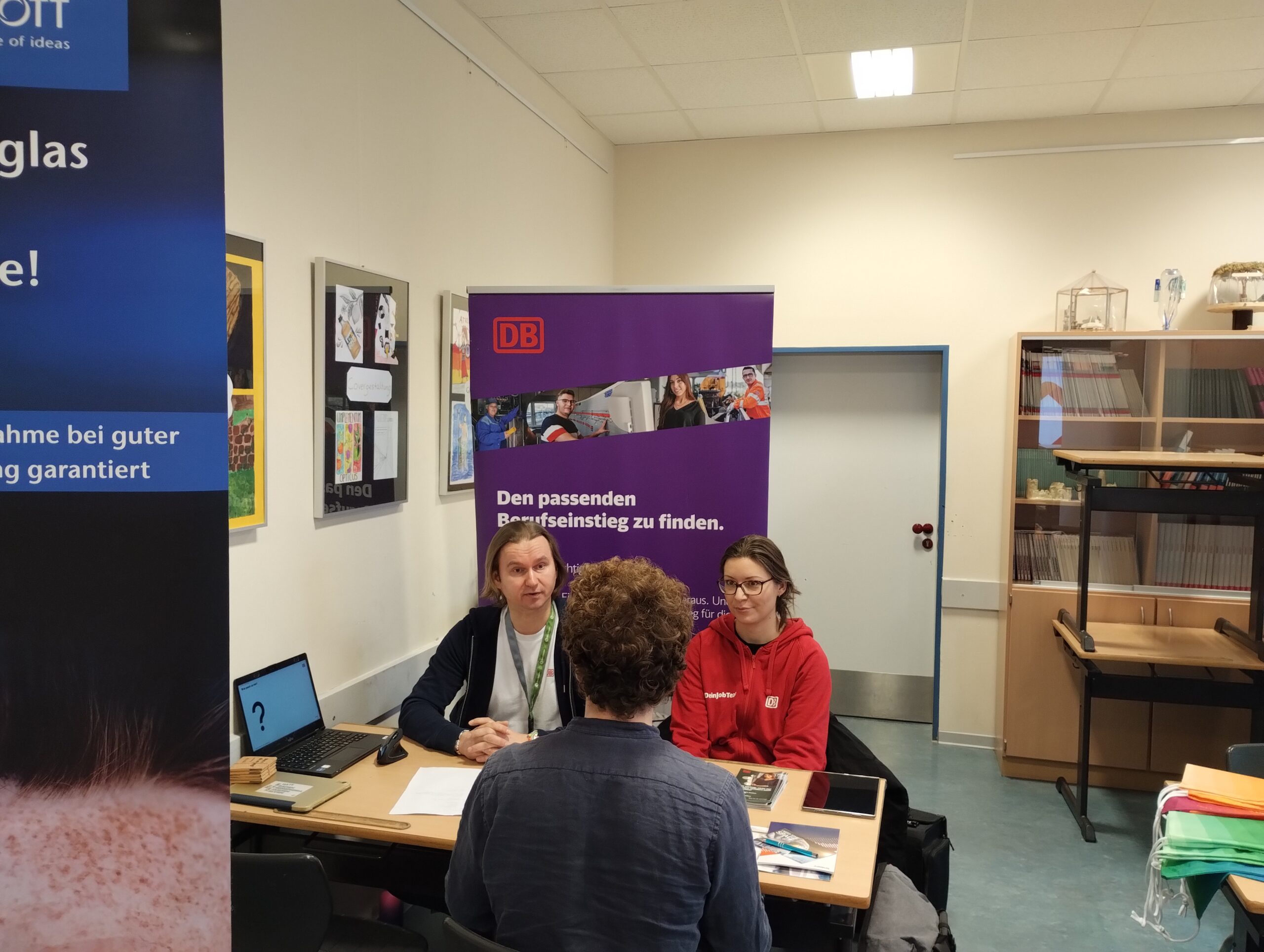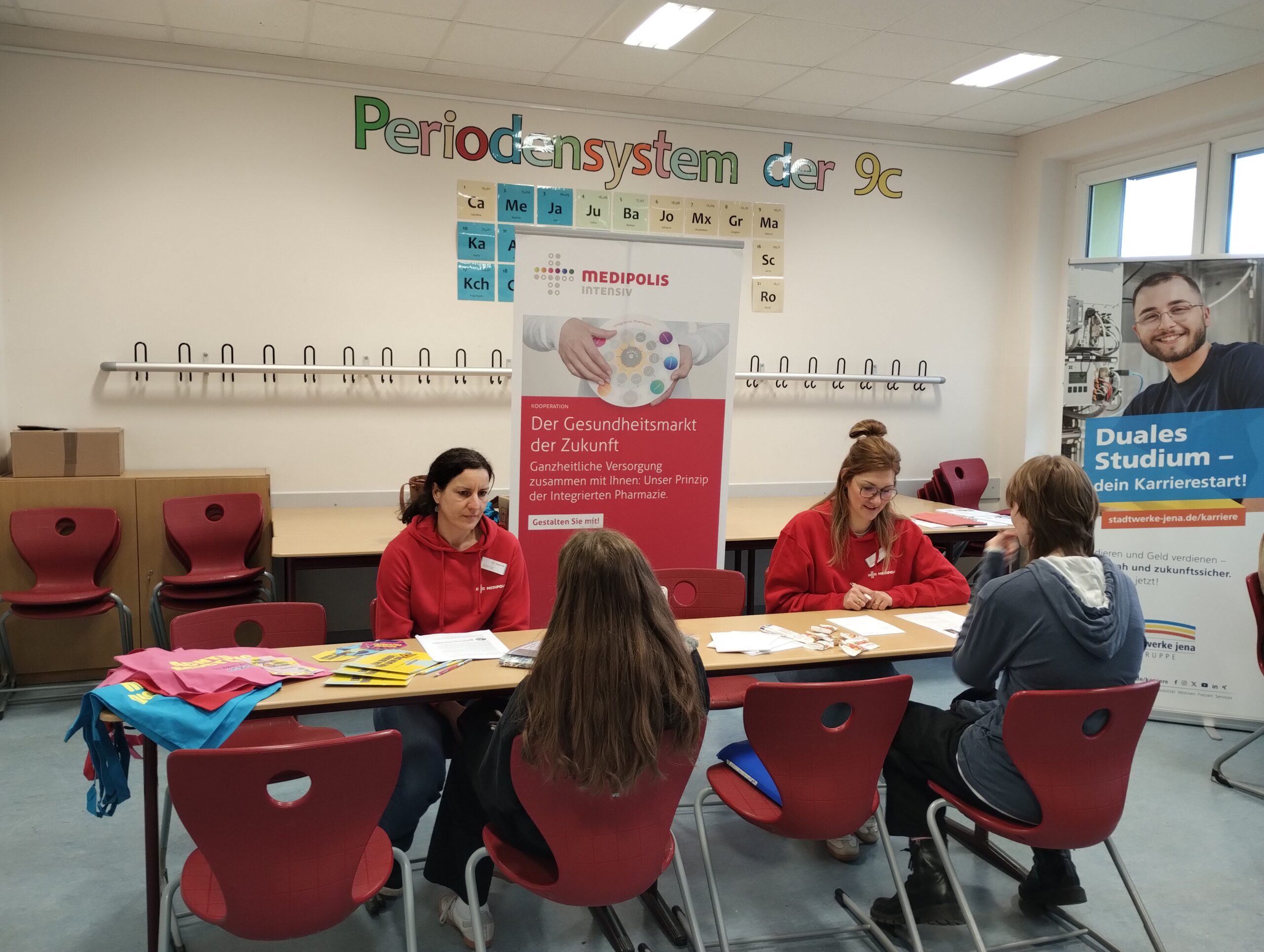 Am letzten Schultag vor den Winterferien erwartete unsere Elftklässler ein ganz besonderer Projekttag: Zum vierten Mal führten 18 regionale und überregionale Unternehmen einen Tag rund um das Thema Bewerbung durch. Unsere Schülerinnen und Schüler erhielten durch die Firma Jena Optronik GmbH einen Einblick in das unternehmensinterne Einstellungsverfahren und knobelten an dem mitgebrachten Wissenstest. Das Deutsche Luft- und Raumfahrtinstitut (DLR) zeigte unseren Elftklässlern, wie die Berufswelt durch KI beeinflusst werden wird. Im Bewerbungstraining erhielten unsere Schülerinnen und Schüler die Möglichkeit, mit drei Firmen ein jeweils 15minütiges Bewerbungsgespräch zu führen und von geschulten Mitarbeitenden ein ehrliches Feedback zu ihrem Auftreten und ihren vorbereiteten Lebensläufen zu erhalten. Abschließend bot eine Miniberufsmesse die Gelegenheit, mit allen Firmen noch einmal ins Gespräch zu kommen.