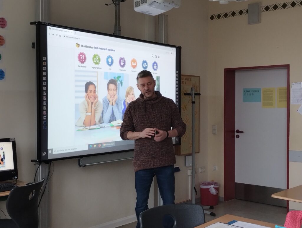 Unsere Schülerinnen und Schüler der Jahrgangsstufe 9 absolvierten in dieser Woche einen Projekttag zum Thema „Berufsorientierung“. Sie legten im Foyer der Schule die Berufsfelder als Bodenpuzzle zusammen und leiteten anhand eigens erstellter Berufestammbäume Entwicklungen und Tendenzen, die in der Berufswelt stattgefunden haben und stattfinden, ab. Anschließend thematisierte die IHK mit unseren Klassen den Ablauf eines Bewerbungsgesprächs, gab einen Überblick über Fragen, die in einem Bewerbungsgespräch nicht und solche die gestellt werden dürfen, und stellte abschließend das IHK-Schülercollege vor. Einen herzlichen Dank an dieser Stelle für die zuverlässige und langjährige Zusammenarbeit mit der IHK.