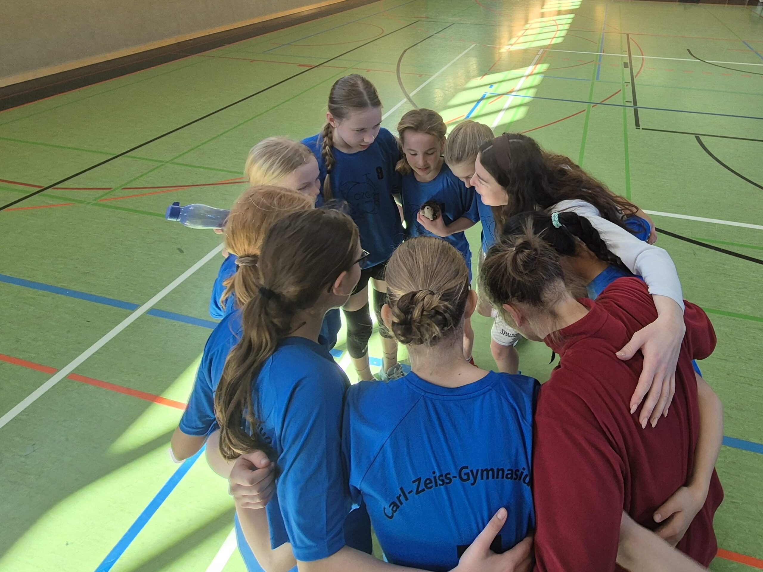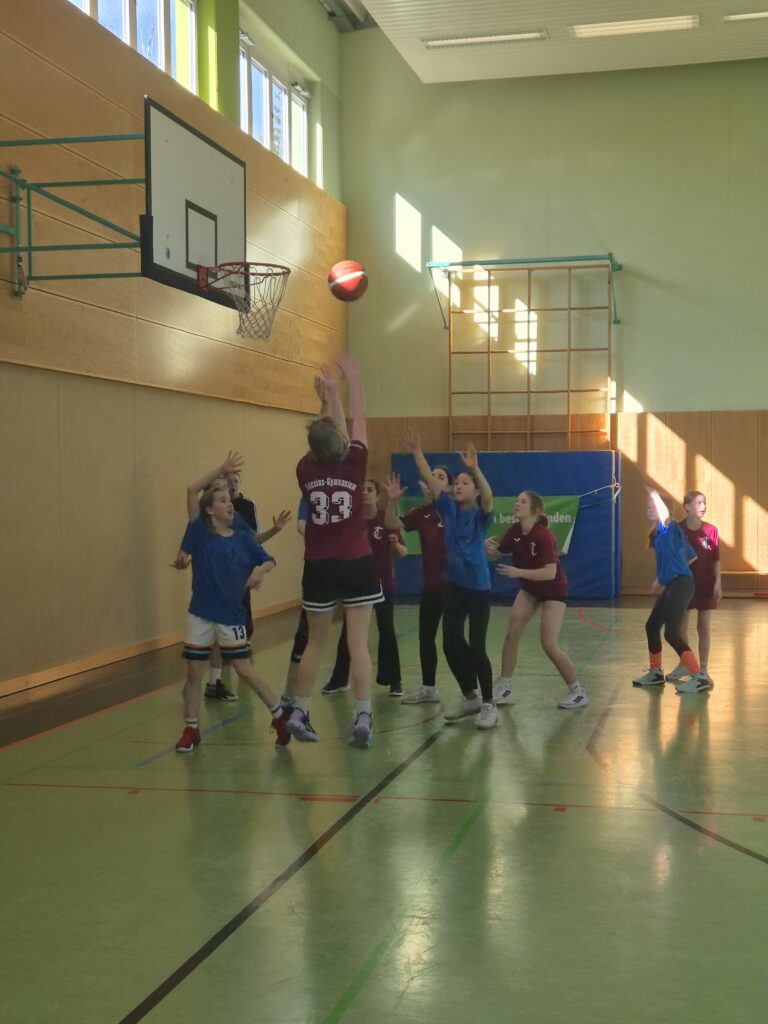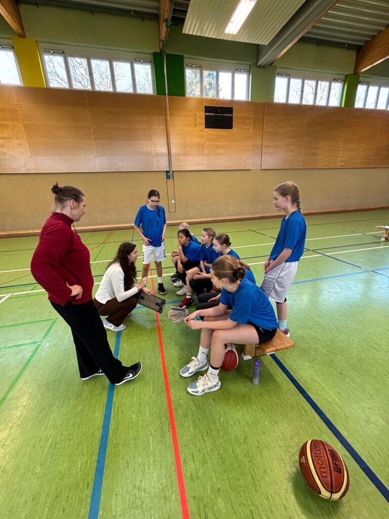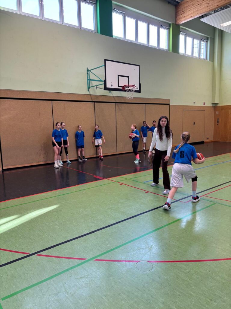Vor dem ersten Spiel nutzten unsere Schülerinnen die Zeit zum professionellen Einspielen, genau so konzentriert und strukturiert wie im Training. Während des gesamten Turniers wurden sie von Trainerin Vanessa engagiert gecoacht. Allerdings waren die Bedingungen in der Halle schwierig: Der Boden war sehr rutschig. Doch unsere Spielerinnen bewiesen Kreativität und Teamgeist – mit kleinen Tricks (unter anderem Haarspray auf den Schuhsohlen) wurde versucht, mehr Halt zu bekommen. 😄