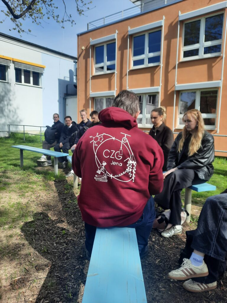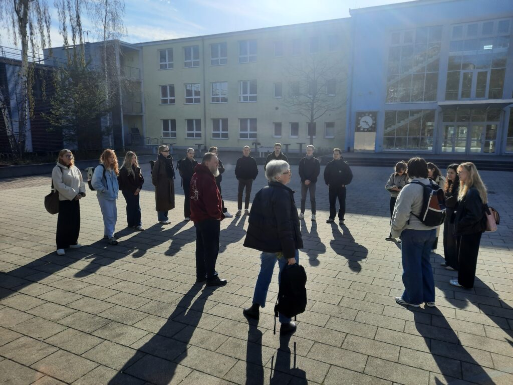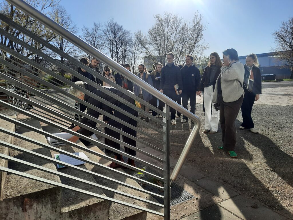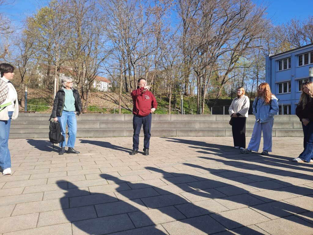 Um das Projekt zu realisieren und weitere Anregungen zu erhalten, besuchten die Studierenden zusammen mit der Professorin für einen Vormitttag auch Jena und besichtigten das Schulgebäude in der Erich-Kuithan-Straße. Da es immer günstig ist, mit Experten zu Themen zu sprechen, stand der ehemalige Schulleiter des Carl-Zeiss-Gymnasiums dankenswerterweise zur Verfügung. Dr. Carsten Müller nahm sich drei Stunden Zeit, um zu Aspekten der Schulgeschichte, den baulichen Vorhaben und Veränderungen sowie zu deutlichen Spuren seiner Lieblingswissenschaft, der Mathematik, zu sprechen. So nahm er die Studierenden mit durch das Haus, um nicht nur an den Fliesenmosaiken zu zeigen, wie anschaulich Mathematik sein kann – auch auf dem Schulhof gibt es mit den Kegelschnitten mit Leitlinien und den n-eckigen Tischen mit den Jahrespreisträgern des Fördervereins viele Möglichkeiten, eine abstrakte Wissenschaft anschaulich zu machen.